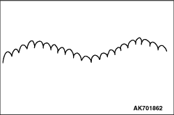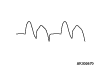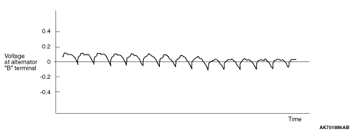 note The voltage waveform of the alternator "B" terminal can undulate as shown in the illustration. This waveform is produced when the regulator operates according to fluctuations in the alternator load (current), and is normal for the alternator. In addition, when the voltage waveform reaches an excessively high value (approximately 2 V or higher at idle), it often indicates an open circuit due to a brown fuse between alternator "B" terminal and battery, but not a defective alternator.