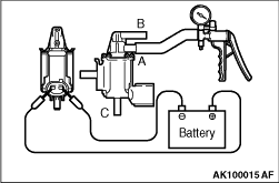 1.Disconnect the vacuum hose from the solenoid valve. 2.Disconnect the harness connector. 3.Connect a hand vacuum pump to nipple (A) of the solenoid valve (refer to the illustration