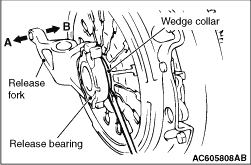 2.While pushing the release fork by hand in the direction A, insert a flap-tip screwdriver between the release bearing and the wedge collar.