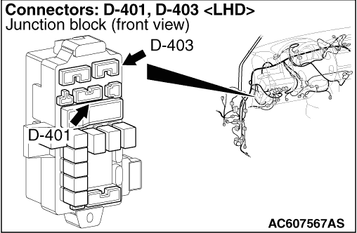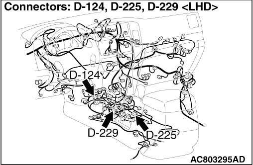 STEP 3. Connector check: D-401 J/B connector, D-225, D-229 intermediate connector, D-124 transfer-ECU connector. |
