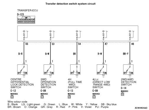 When the transfer position is other than 2H, connector C-08 terminal No.1 resistance should measure open circuit.
