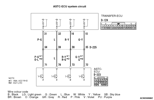 STEP 4. Check the harness between transfer-ECU connector D-124 terminal No.15, 16, 31, 32 and ASTC-ECU connector D-223 terminal No.72, 73, 71, 79. |