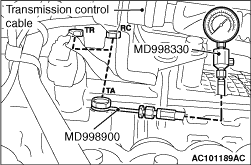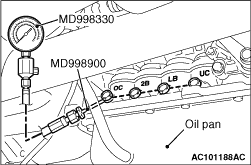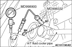 3.Connect the special tools (oil pressure gauge (3.0 MPa) [MD998330] and adapters [MD998332, MD998900]) to each pressure discharge port.