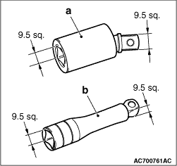 note The drive plate connecting bolt can be tightened to the specified torque easily by using the recommended tool [9.5 sq. flex ball joint (distributed by KTC, model number BJF20 <a in the figure>), or 9.5 sq. extension bar (swing head type) (distributed by KTC, model number BE3-030JW <b in the figure>) ].