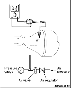 4.Adjust the outside air pressure with the air regulator until the pressure gauge shows approx. 24.5 kPa. 5.Lock the wheel on one side of the vehicle, and slowly turn the wheel on the other side. 6.Check for continuity in the rear differential lock detection switch.