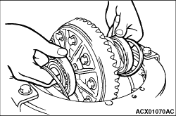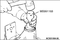 5.Tap the side bearing adjusting spacers with special tool bar (MB990939) to fit them to the side bearing outer race.