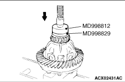 11.Fit the selected drive pinion rear shim(s) to the drive pinion, and press-fit the drive pinion rear bearing inner race by using special tool bearing installer (MB990802).