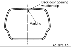 Align the marking section on the back door opening weatherstrip with the centre of the body. |