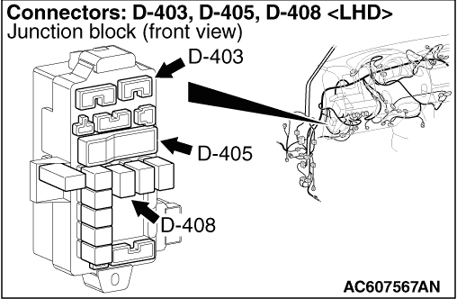 note Prior to the wiring harness inspection, check intermediate connector D-133 <LH drive vehicles>, D-114 <RH drive vehicles> and junction block connector D-403, and repair if necessary.
