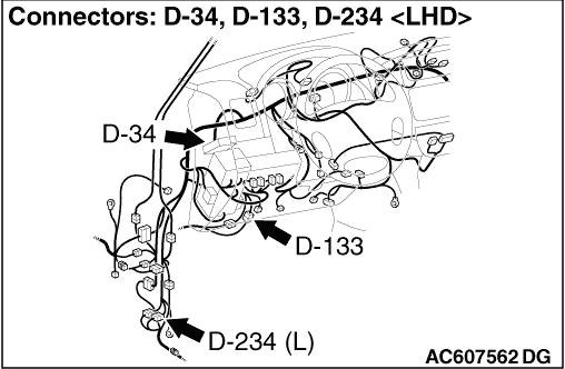 | note | Prior to the wiring harness inspection, check intermediate connectors D-114, D-133 and joint connector D-34, and repair if necessary. |