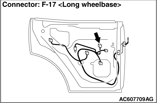 STEP 10. Connector check: F-02 power window main switch connector and F-17 rear power window sub switch (LH) connector