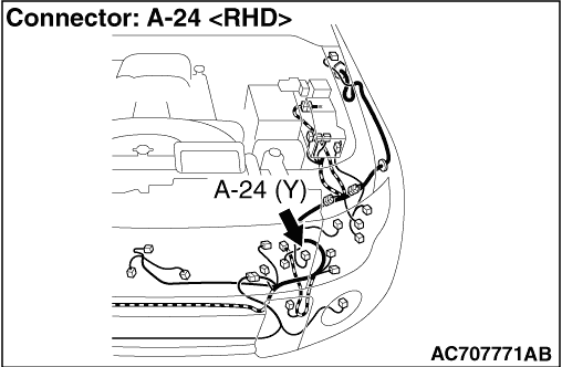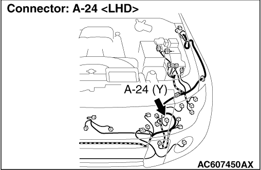 Repair the harness wires between SRS-ECU connector D-24 (terminal No.38 and 39) and front impact sensor (LH) connector A-24 (terminal No.1 and 2).