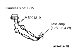 (2)Use special tool MB991219 to connect a test lamp (12 V - 3.4 W) between the wiring harness connector terminals 1 and 2.