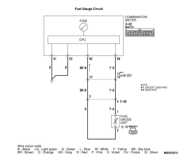STEP 4. Check the wiring harness between combination meter connector D-02 (terminals 40 and 49) and fuel tank gauge unit connector E-15 (terminals 2 and 1).