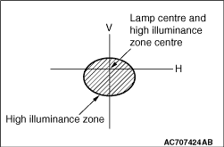 Standard value: Vertical direction and horizontal direction; Intersecting position of vertical line (V) and horizontal line (H) Limit: Vertical direction; 26 mm (0.5°) or less below the horizontal (H) Horizontal direction; ±26 mm (±0.5°) from the vertical line (V)