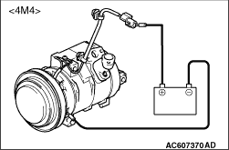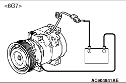 Connect the connector battery to positive battery terminal in the A/C compressor, and then earth the battery (-) terminal to the A/C compressor itself. At this time, check that the magnetic clutch operating sound can be heard.