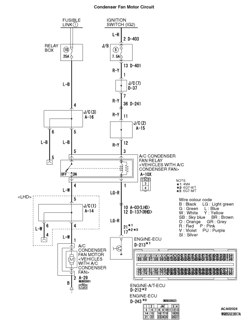 - Check the A/C condenser fan relay power supply line for open circuit.