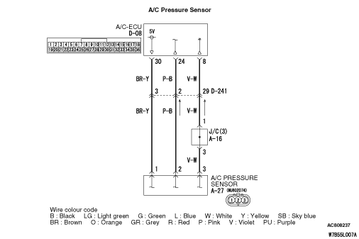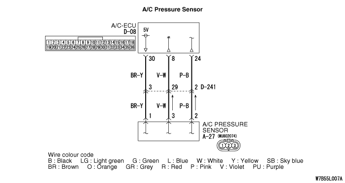 STEP 2. Check the wiring harness between D-08 A/C-ECU connector (terminals 8, 24 and 30) and A-27 A/C pressure sensor connector (terminals 3, 2 and 1).