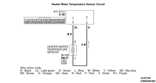 STEP 2. Check the wiring harness between D-08 A/C-ECU connector (terminals 8 and 25) and D-112 heater water temperature sensor connector (terminals 1 and 2).