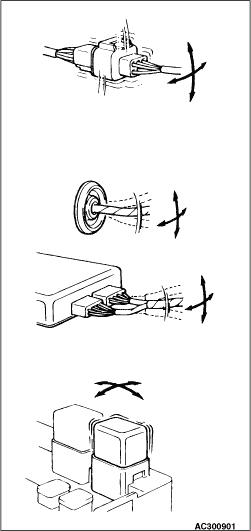 Intermittent malfunctions often occur under certain conditions, and if these conditions can be ascertained, determining the cause becomes simple. In order to ascertain the conditions under which an intermittent malfunction occurs, first ask the customer for details about the driving conditions, weather conditions, frequency of occurrence and trouble symptoms, and then try to recreate the trouble symptoms. Next, ascertain whether the reason why the trouble symptom occurred under these conditions is due to vibration, temperature or some other factor. If vibration is thought to be the cause, carry out the following checks with the connectors and components to confirm whether the trouble symptom occurs. The objects to be checked are connectors and components which are indicated by inspection procedures or given as probable causes (which generates diagnosis codes or trouble symptoms).