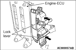 Press the lock button to unlock the lock lever. While pressing the connector cover against the engine-ECU, turn the lock lever to the vertical position. Then, disconnect the connector from the engine-ECU.