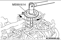 9.Use the special tool (MB991614) to tighten the engine front side bolts of the fuel injector holder to 90° ± 1°.