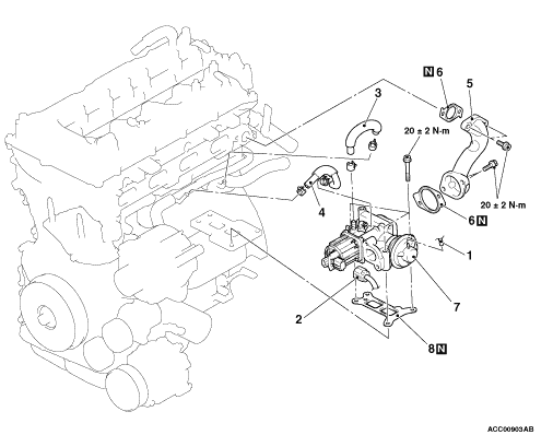 1.Install each gasket with its projection being positioned as shown in the figure. 2.Temporarily tighten the EGR valve assembly to 1.3 ± 0.7 N·m. 3.Temporarily tighten EGR valve pipe A to 1.3 ± 0.7 N·m.
