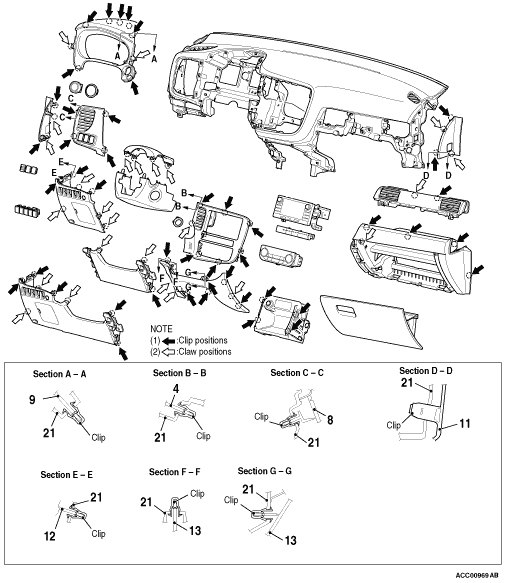 • For the removal of the front passenger’s air bag module, refer to GROUP 52B - Service Precautions , Driver’s and Front Passenger’s Air Bag Module, and Clock Spring before operation.