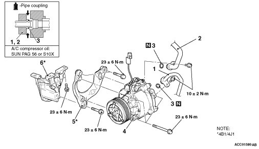 3.Tighten A/C compressor assembly mounting bolts to the specified torque in the